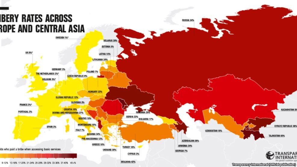 Në Taxhikistan, ku ryshfetet për shërbimet publike që do të duhej të ishin të qasshme për të gjithë dhe pa pagesë, paguajnë rreth 59 për qind e qytetarëve, në Modavi 42 për qind dhe Rusi 34 për qind.