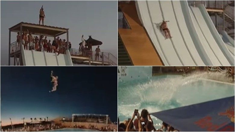 Ky është momenti i çmendur kur një burrë i trashë del nga “kulmi i një rrëshqitëse” dhe bie në ujë.