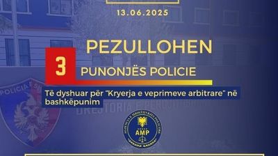 Agjencia e Mbikëqyrjes Policore ka pezulluar nga detyra tre punonjës policie të dyshuar për kryerjen e veprës penale “Kryerje e veprimeve arbitrare në bashkëpunim”.