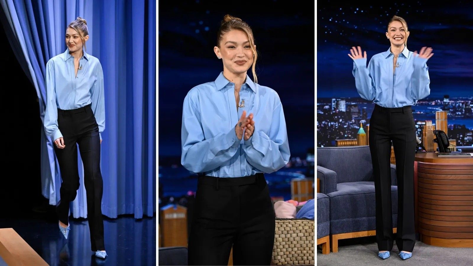 Hadid e futi këmishën nën pantallona e zeza me bel të lartë dhe prerje të drejtë, më pas e plotësoi veshjen me disa prekje të tjera të ngjyrës blu – këtë herë, në formën e bizhuterive me diamante nga Alexei Hay dhe këpucët Jimmy Choo me lidhëse.