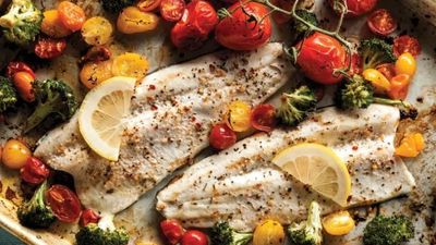 Troftë në furrë me salcë limoni dhe garniturë perimesh