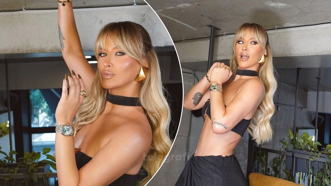 Në imazhet e postuara, Tuna shfaqet me një stil të guximshëm dhe modern, veshur me një ansambël të zi të ngushtë që thekson linjat e saj trupore.