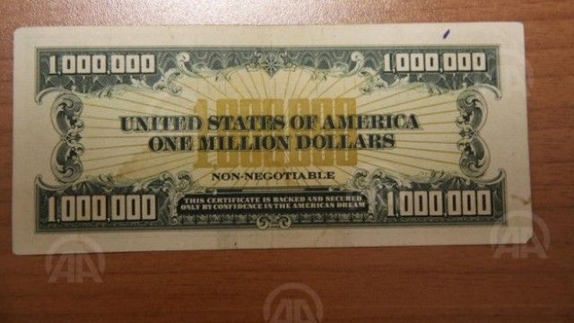 Ndërsa bankënota 1 milion dollarëshe e certifikuar e cila shtypet në një numër të caktuar në Shtetet e Bashkuara dhe që përdoret krahas koleksionistëve edhe në transfertat bankare u konfiskua nga prokuroria e Saruhanllë. Gjithashtu mësohet se bankënota 1 milionë dollarëshe do ti dorëzohet bankës qendrore, raporton AA, transmeton Telegrafi.