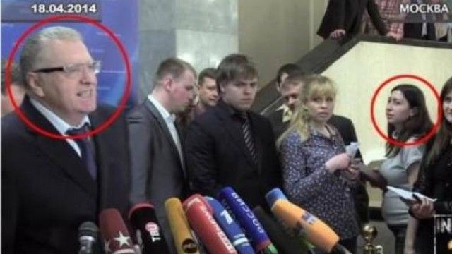 Kur gazetarja nisi ta pyeste për situatën në Ukrainë, sipas televizionit Russia Today, Zirinovsky urdhëroi ndihmësit e tij që ta përdhunonin gazetaren 6-muajshe shtatzënë, Stella Dubovitskaya, e cila nga një kërcënim i tillë i bërë përpara të gjithë mediave që ishin të pranishme në konferencën e shtypit, përfundoi në spital si pasojë e tronditjes.