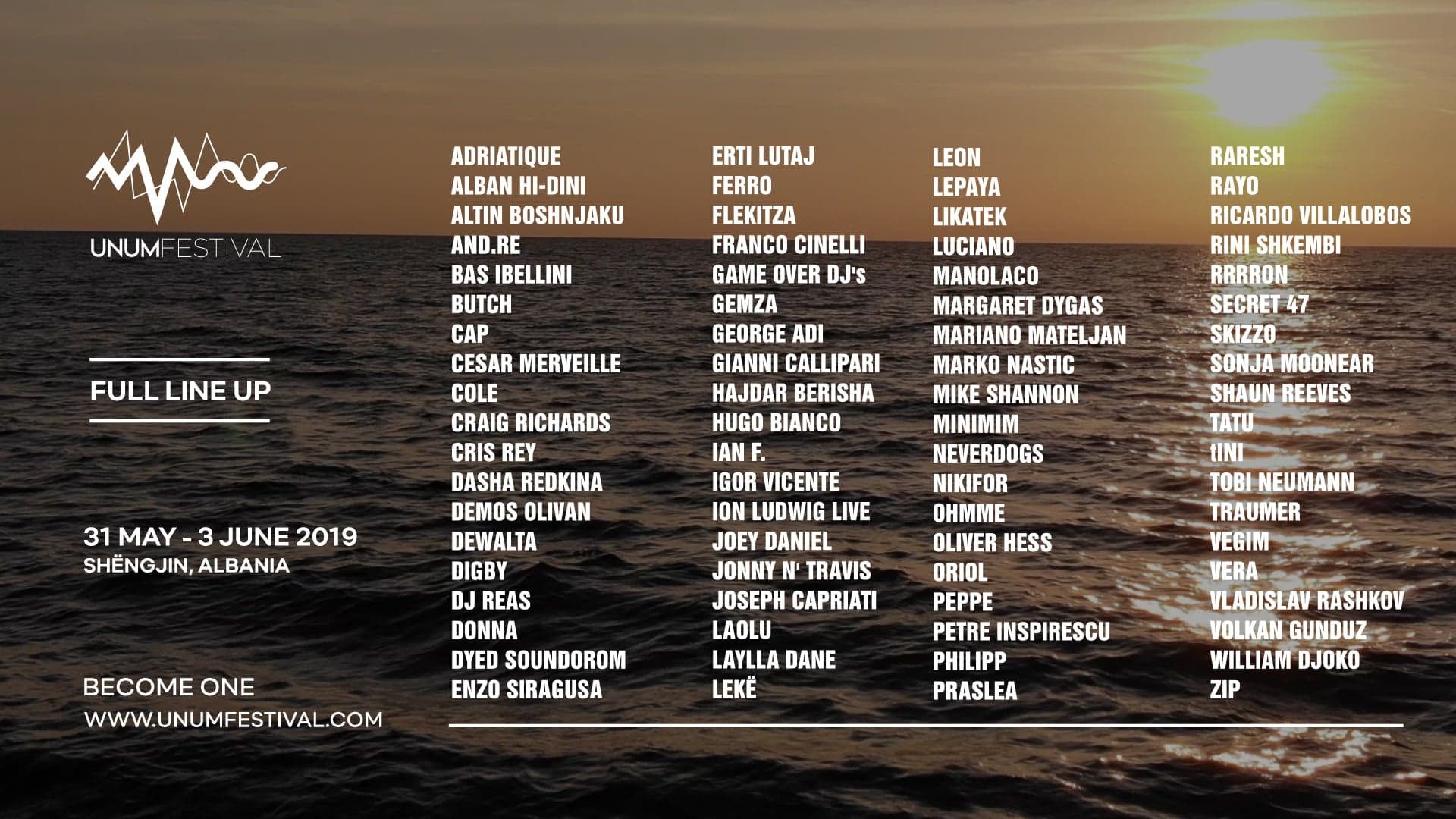 Festivali ndërkombëtar i muzikës elektronike, UNUM festival, ka publikuar sot listën e plotë të artistëve të cilët do të performojnë prej datës 31 maj deri më 3 qershor te Rana e Hedhun në Shëngjin.