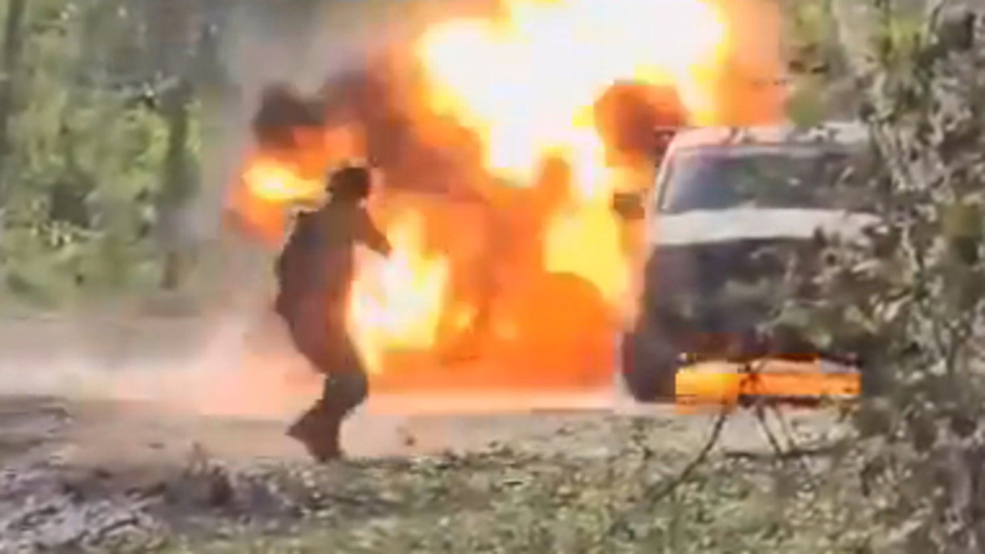Ushtari shikon i lehtësuar ndërsa topi i zjarrit bie me pjesë mekanike menjëherë pas automjetit të tij.