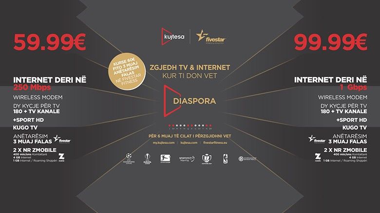 Pako Diaspora i’u mundëson internetin e shpejtë deri ne 1GBPS dhe kanalet më të përzgjedhura të televizionit digjital, duke përfshirë edhe kanalet e sportit me ligat më ekskluzive që transmeton Kujtesa si: Champions League, Europa League, Bundesliga Gjermane, Superliga Turke, NBA, Euroaliga e Basketbollit dhe Kupa e Spanjes ‘Copa Del Rey’.