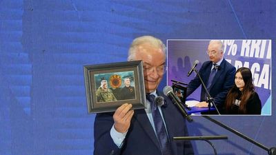 Vajza e ish-ushtarit të UÇK-së i dhuron Xhavit Halitit në Pejë fotografinë e Thaçit dhe Veselit