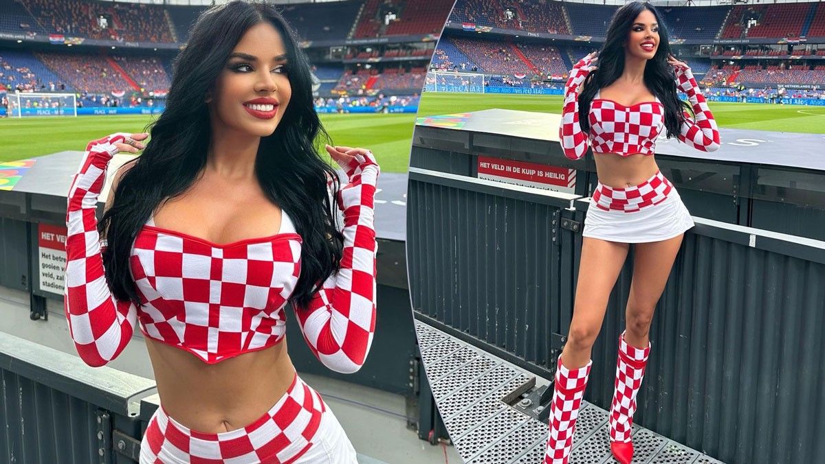 E veshur me minifund, çizme dhe pjesën e sipërme të kombinuar me simbolet kroate, ajo është kujdesuar për një sërë pozash atraktive.