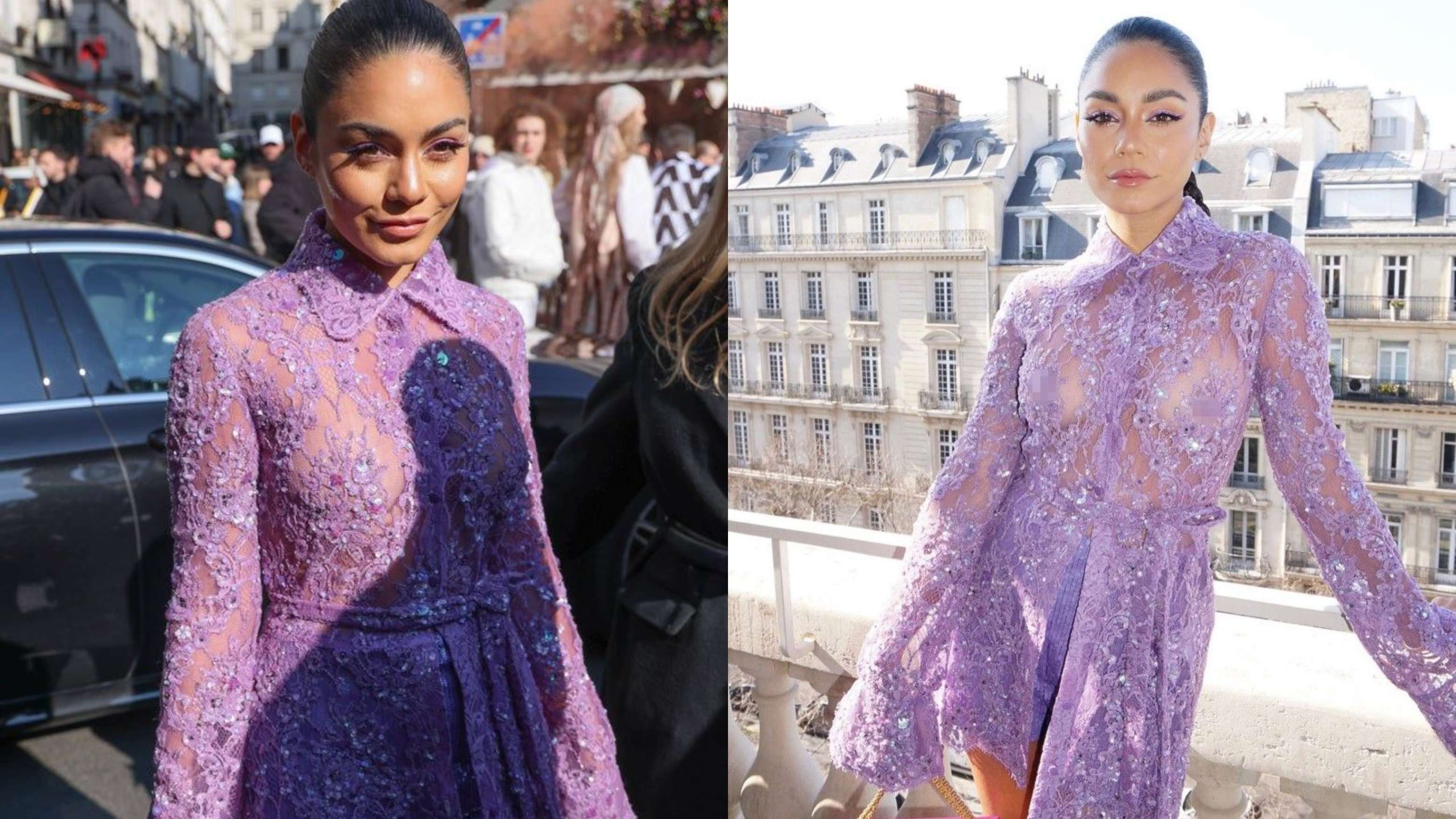 Vanessa Hudgens dukej gati për pranverë me një fustan seksi me dantella ngjyrë livando nga Valentino në shfaqjen e Javës së Modës në Paris të dielën.