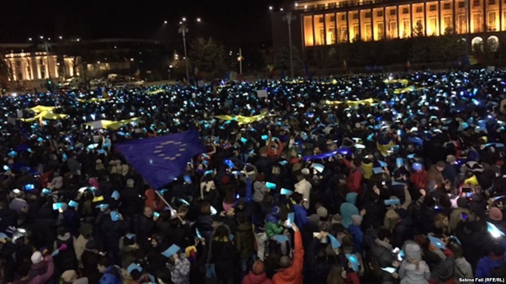 Mbrëmë demonstruesit janë tubuar në Sheshin e Fitores, afër ndërtesave qeveritare, duke i valëvitur flamujt rumunë dhe amerikanë.