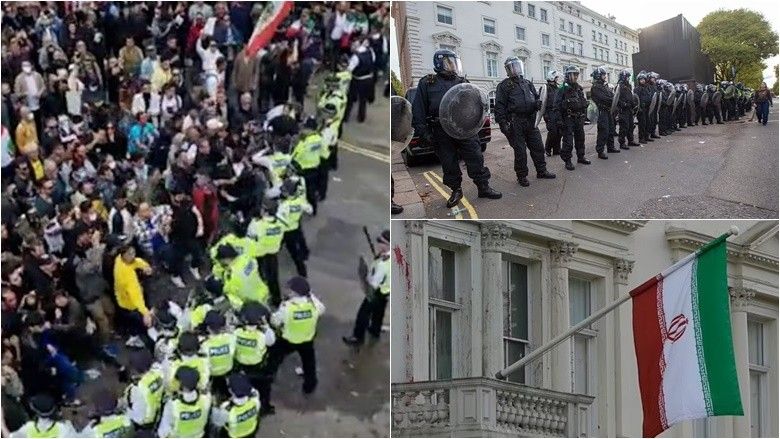 Protestuesit po bënin thirrje për t'i dhënë fund Republikës Islamike të Iranit, duke bërtitur dhe shtyrë kundër oficerëve që kishin krijuar një rresht përpara ambasadës.