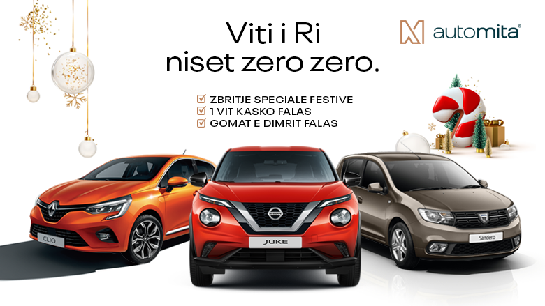 - Zbritje festive- 5 vjet garancion- 1 vjet kasko falas- Gomat e dimrit falas Oferta, e cila vlen për veturat e brendit Renault, Nissan dhe Dacia, qysh në ditët e para ka arritur të thyej rekorde të shitjes, duke pasur interesim të jashtëzakonshëm të klientëve që duan t’i nisin aventurat e vitit të ardhshëm me veturë të re!