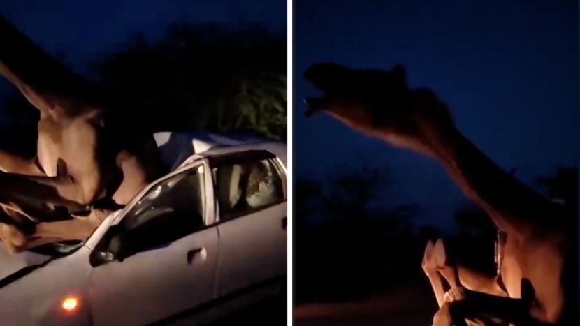 Një aksident i pazakontë është regjistruar në veri të Indisë, pasi një veturë e markës Suzuki ka përplasur një deve në një rrugë fshati, në orët e mbrëmjes.