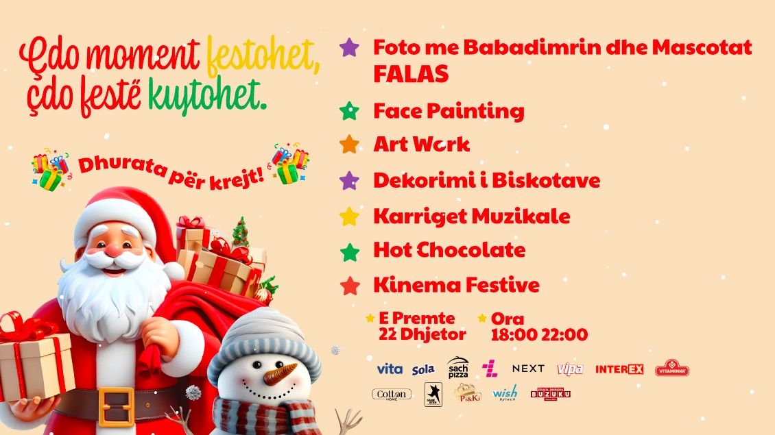 Vitaland ju fton të bashkoheni në festën më magjike të vitit më 22 Dhjetor nga ora 18:00 deri në ora 22:00! Me aktivitete të veçanta si: Face Painting, Art Work, Karriget Muzikale, Dekorimi I Biskotave, Kinema Festive dhe foto FALAS me babadimrin & maskotat e plot surpriza dhe dhurata tjera.