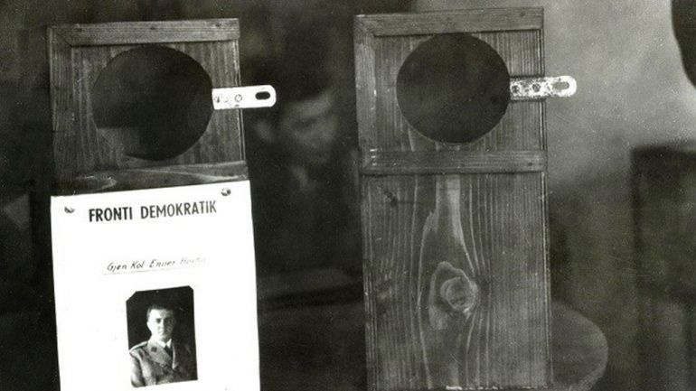 Në foton e parë shikojmë dy nga kutitë e votimit, të përdorura në zgjedhjet për Asamblenë Kushtetuese, më 2 dhjetor 1945. Kutia e parë mbante përsipër fotografinë dhe emrin e kandidatit të “Frontit Demokratik”, në këtë rast të Enver Hoxhës. Tek kutia nuk është shkruar as kryeministër, as sekretari i parë, por “gjeneralkolonel Enver Hoxha”, sepse asokohe gradat ushtarake ishin më mbresëlënëse në popull (siç është tani bie fjala titulli “profesor doktor”, paçka se personi mund të jetë larg të qenit i tillë). Kutia e dytë ishte pa emër, ose kutia e “armikut”, megjithëse asnjë formacion tjetër politik përveç “Frontit Demokratik” (d.m.th. Partisë komuniste), nuk u lejua të merrte pjesë në zgjedhje, sido që formalisht kjo ishte e mundur.