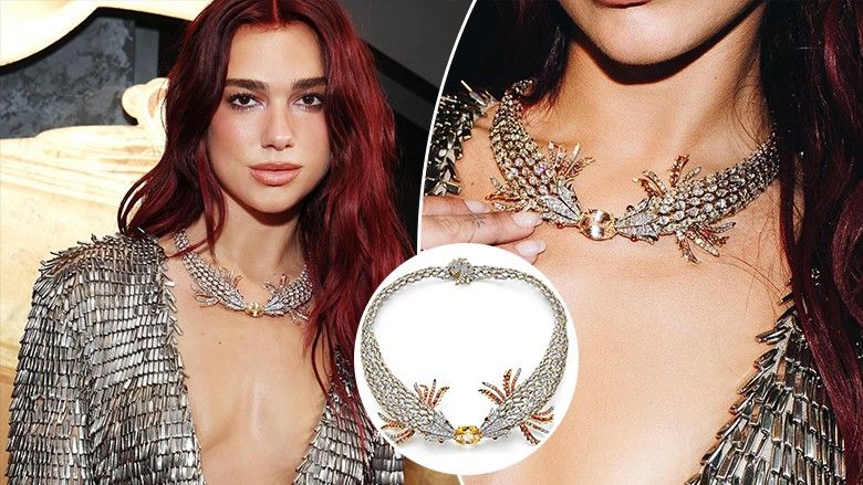 Dua Lipa shtoi një byzylyk diamanti dhe unaza nga koleksioni blu i vitit 2023. Byzylyku kishte një bazë shirit platini me ari dhe diamantë të kombinuar me safirë "padparadscha" të papërpunuara. Ndërsa unaza përmbante një safir të shtrenjtë nga Sri Lanka mbi shtatë karatë me një bandë diamantesh. /Telegrafi/