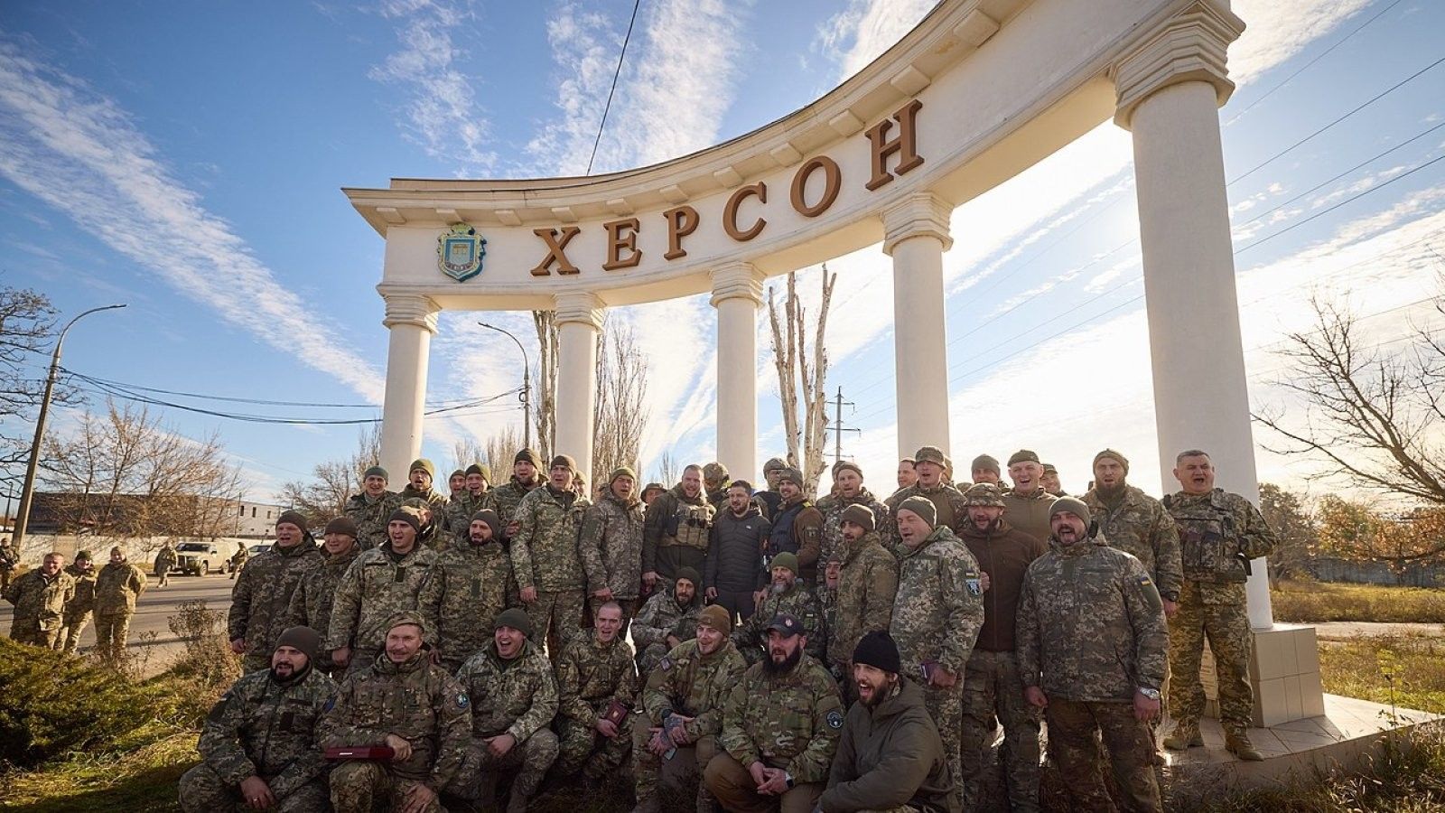 Zelensky postoi një fotografi të tij në hyrje të qytetit, me një tabelë të madhe që mban emrin e Khersonit pas tij.