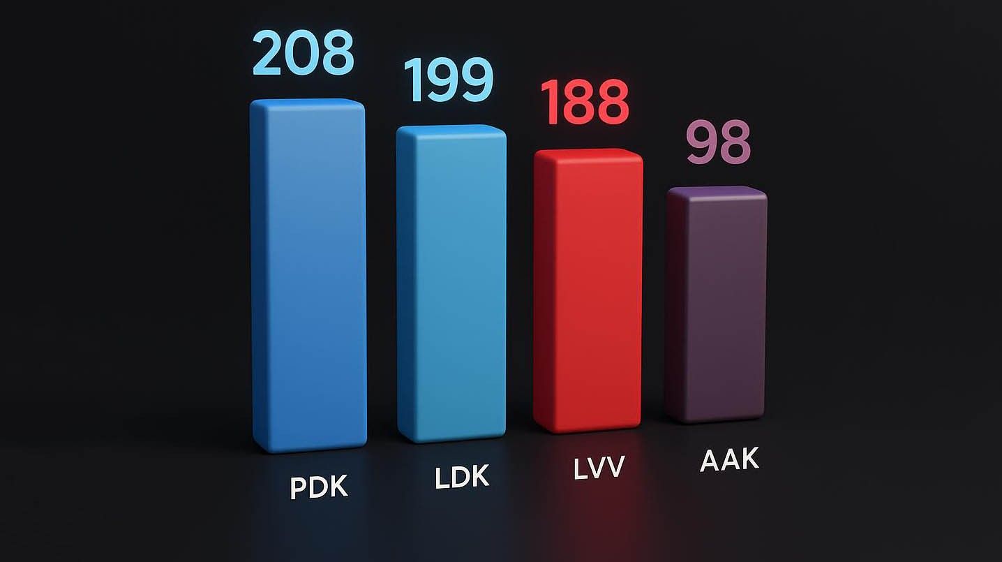 Sipas rezultateve të deritanishme, PDK kryeson me 208 asamblistë, e ndjekur nga LDK me 199, LVV me 188, dhe AAK me 98.