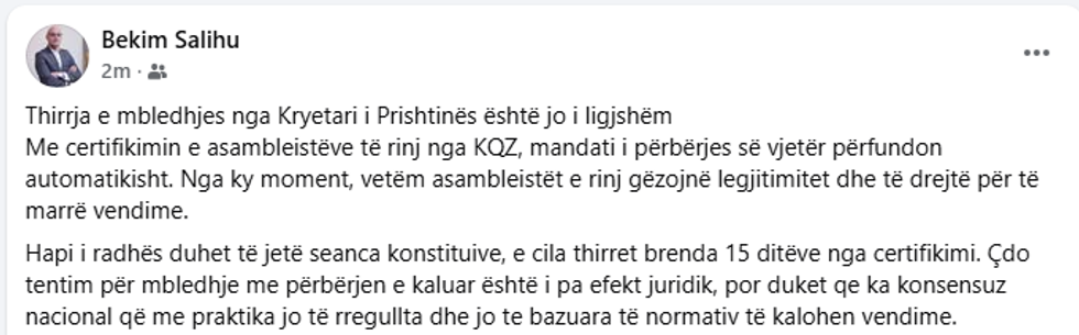 Analisti i politikave në Institutin GAP, Bekim Salihu, ka reaguar lidhur me thirrjen e mbledhjes nga Kryetari i Prishtinës, duke e cilësuar atë si të pa ligjshme.