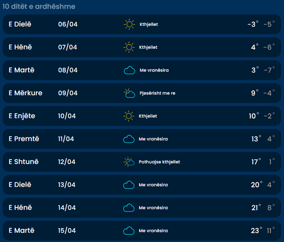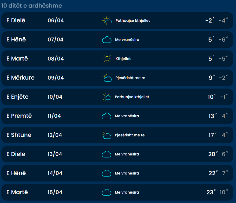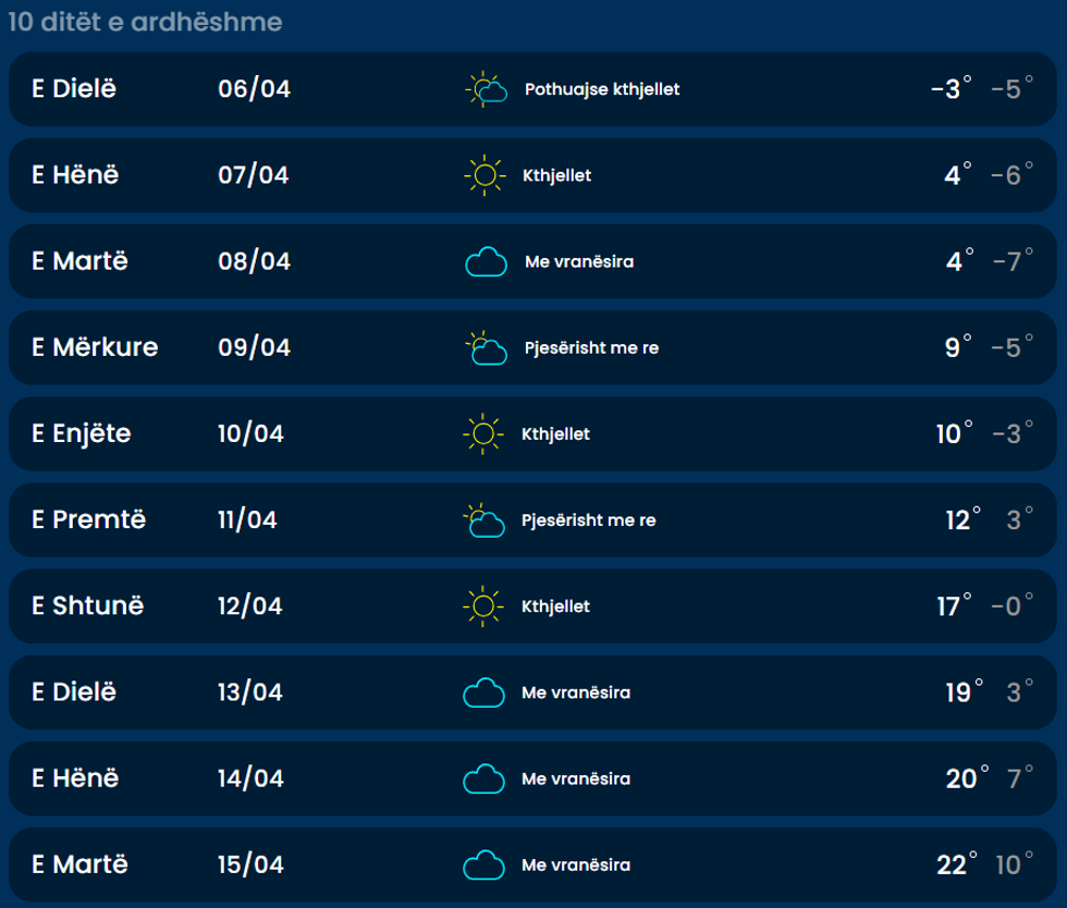 Temperaturat do të pësojnë luhatje të ndjeshme, ndërsa reshjet e shiut dhe uljet e temperaturave do të jenë të pranishme në ditët e para të javës. Nga mesi i javës e tutje, pritet një stabilizim i motit me kthjellime dhe rritje graduale të temperaturave, duke krijuar kushte më të favorshme për aktivitetet e jashtme.