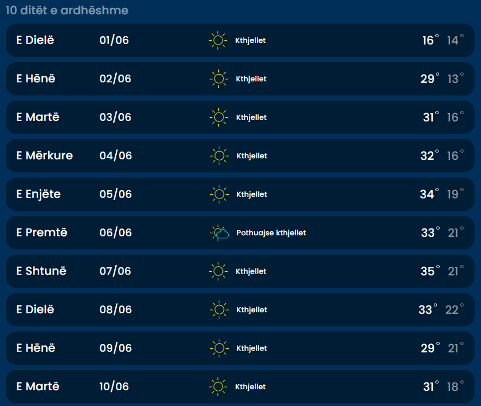 Komunat si Gjilani, Kamenica, Kllokoti, Parteshi, Ranilluni dhe Vitia, ditët e ardhshme do të përjetojnë ditë me diell dhe temperatura që arrijnë deri në 33°C.