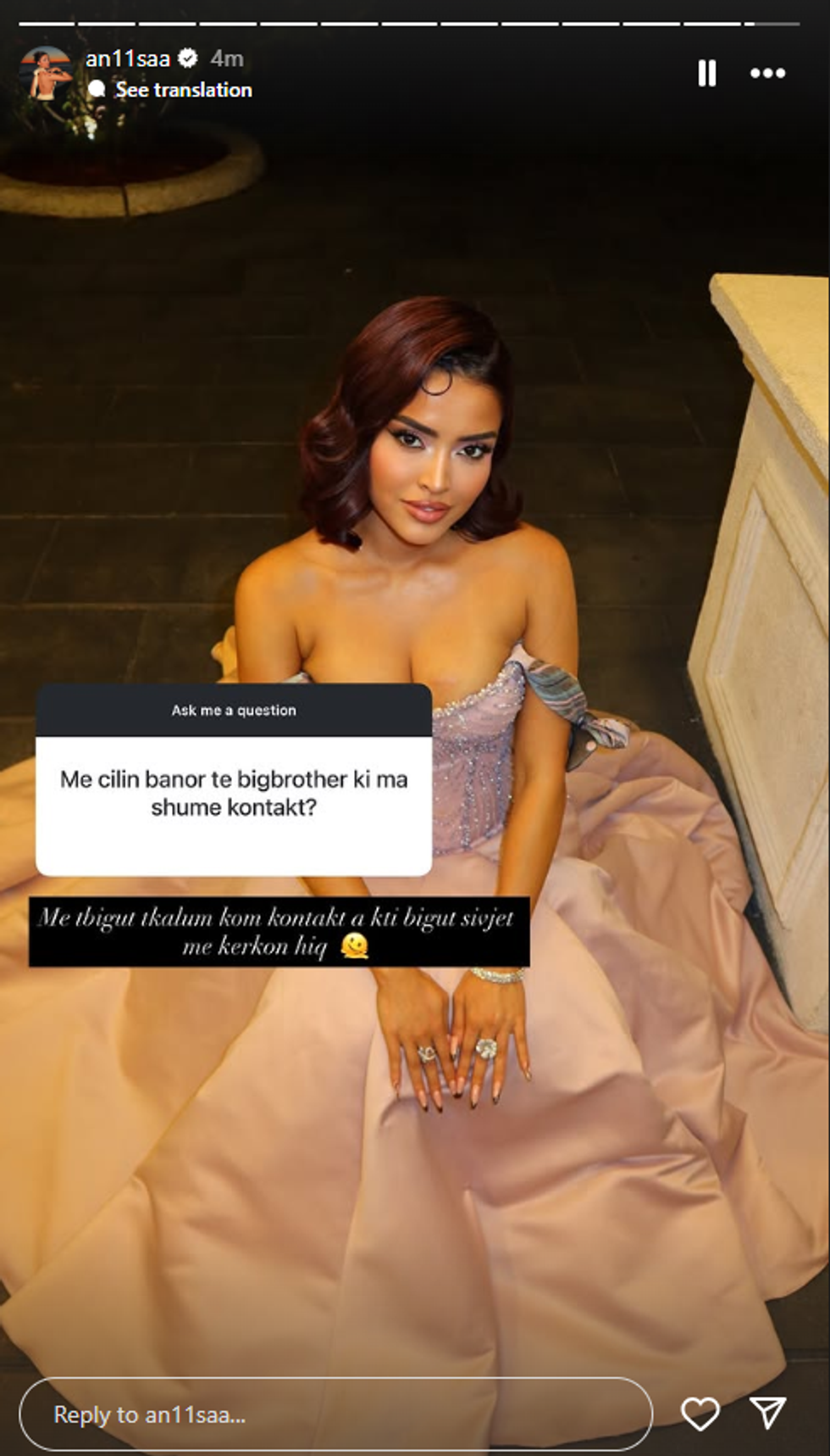 Gjatë një sesioni pyetjesh dhe përgjigjesh, një ndjekës e pyeti drejtpërdrejt: “Me cilin banor të Big Brother ke më shumë kontakt?”.