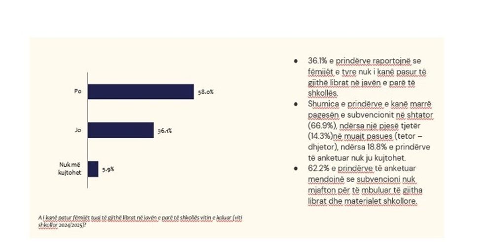 Në pyetjen: “A i kanë pasur fëmijët tuaj të gjithë librat në javën e parë të shkollës vitin e kaluar (viti shkollor 2024/2025)?”, 36.1% e prindërve kanë deklaruar se fëmijët e tyre nuk i kanë pas të gjitha librat, ndërsa 5.9% të fëmijëve nuk ju kujtohet, nëse fëmijët e tyre i kanë pas të gjitha librat.