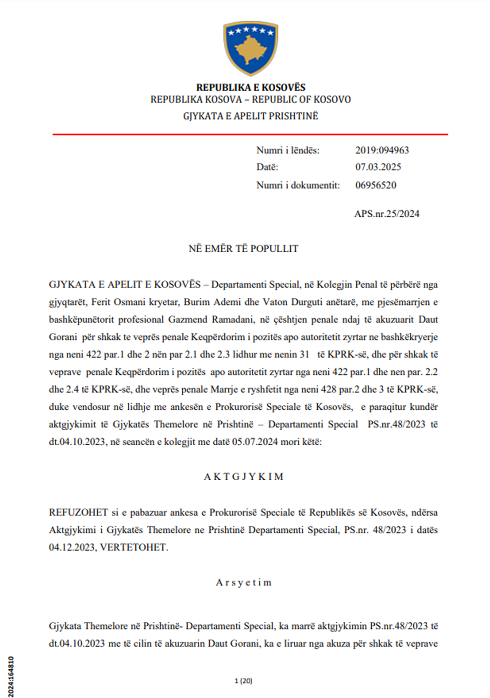 Në këtë aktgjykim, Gjykata Themelore kishte liruar të akuzuarin Daut Goranin nga akuza për veprat penale të keqpërdorimit të pozitës apo autoritetit zyrtar në bashkëkryerje, si dhe për marrjen e ryshfetit, pasi që sipas gjykatës, nuk ishte provuar se i pandehuri kishte kryer veprat për të cilat akuzohej.
