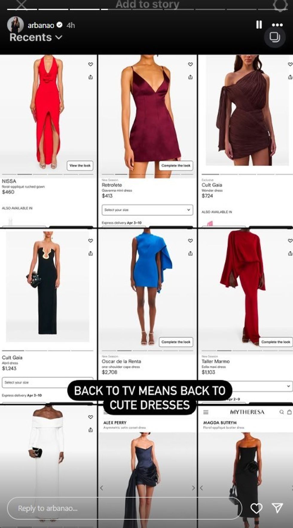 Ajo ka publikuar një listë me fustane të përzgjedhura nga markat më të njohura të modës, duke e shoqëruar postimin me një mbishkrim domethënës: "Back to TV means back to cute dresses" (Rikthimi në TV do të thotë rikthim te fustanet e bukura).