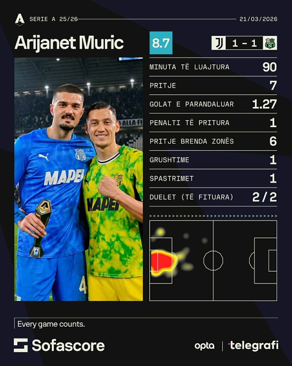 Goditja e italianit u lexua për mrekulli nga Muric, i cili me një super pritje ia siguroi një pikë Sassuolos. Vlen të ceket se “gardiani” i Kosovës bëri edhe disa pritje në minutat e fundit, kësisoj nga "SofaScore' u shpallë "Lojtari i Ndeshjes" me notën 8.7.