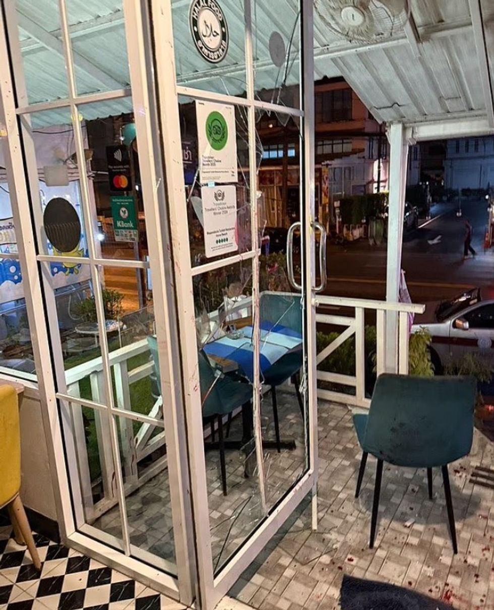 Ndikimi i përplasjes theu derën prej xhami dhe australiani u rrëzua jashtë restorantit.
