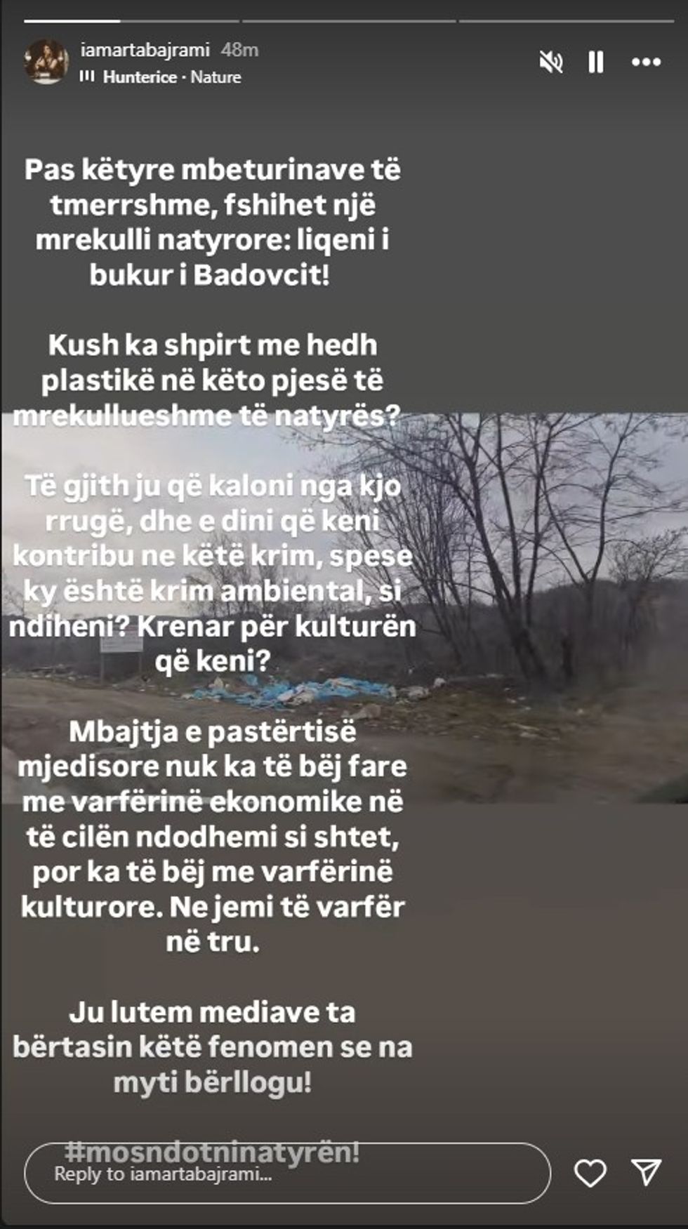 Kjo video u postua në InstaStory, duke sjellë vëmendjen e ndjekësve dhe duke i bërë ata të reflektojnë mbi rëndësinë e mbrojtjes së natyrës. /Telegrafi/