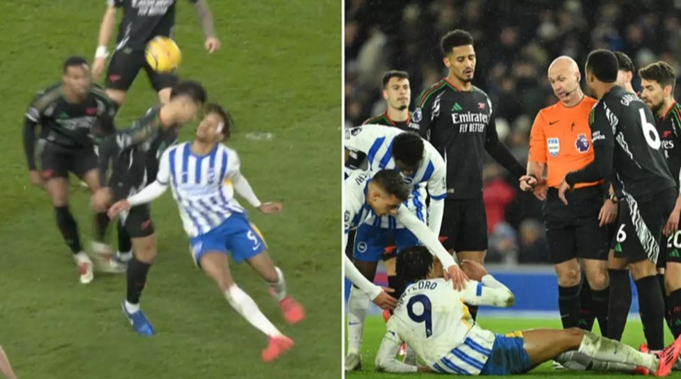 Gjyqtari i ndeshjes, Anthony Taylor akordoi Brighton me një penallti pasi William Saliba u përplas me Joao Pedro.