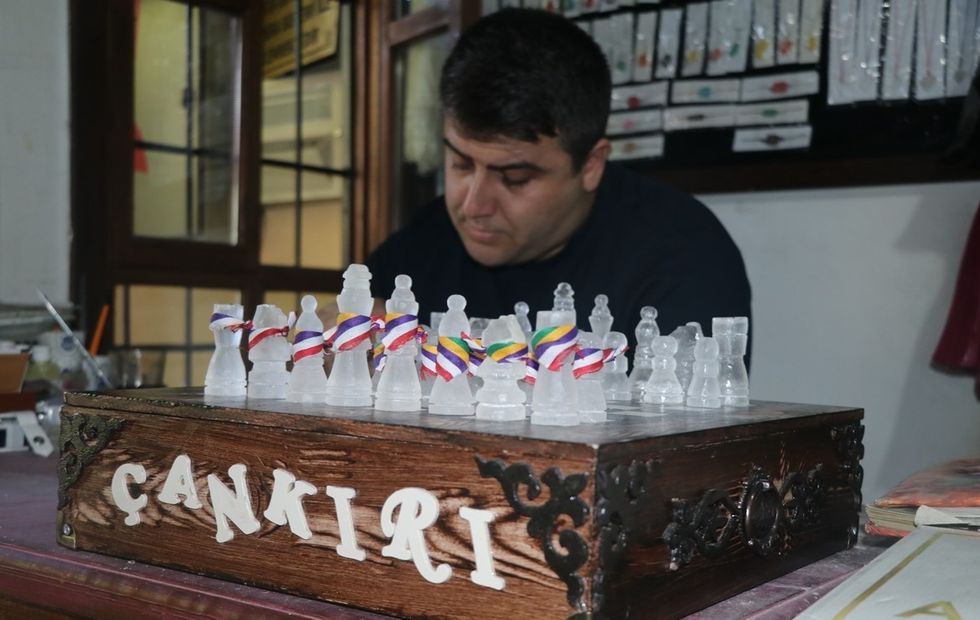 Artizani turk Kürşat Akduman, i cili prodhon sende të ndryshme nga kripa e gurit, ka bërë një komplet shahu prej kripës.