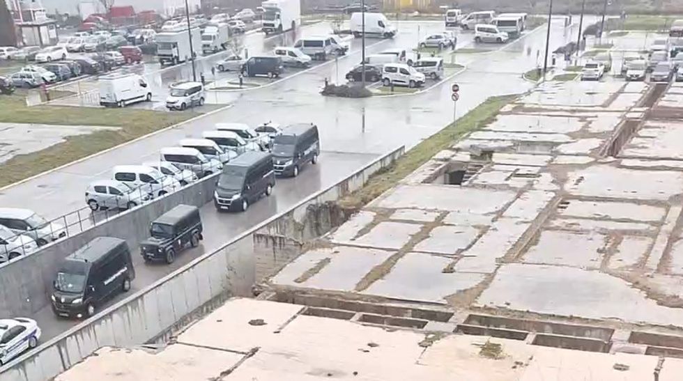 Përreth ndërtesës së RTV-së janë parkuar shumë automjete të policisë.