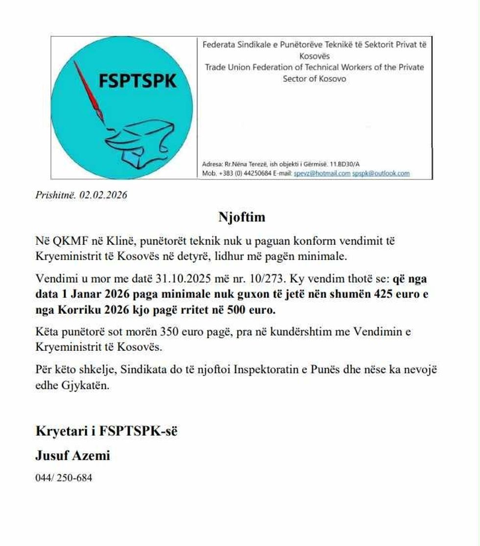 FSPTSPK-ja, thekson se vendimi i kryeministrit i marrë më 31 tetor 2025 parasheh që paga minimale nga 1 janari 2026 të jetë jo më e ulët se 425 euro, ndërsa nga korriku i vitit 2026 të rritet në 500 euro.