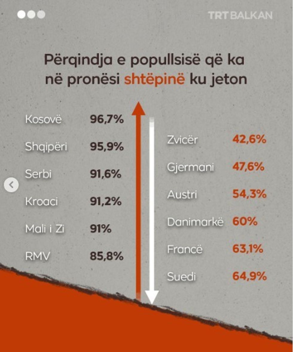 Sipas TRT Balkan, Kosova dhe Shqipëria qëndrojnë në krye të kësaj liste, me nivele pronësie që i kalojnë 95%, duke treguar një lidhje të fortë të qytetarëve me pasurinë e paluajtshme dhe një prirje për të siguruar stabilitet ekonomik dhe familjar përmes zotërimit të shtëpisë.