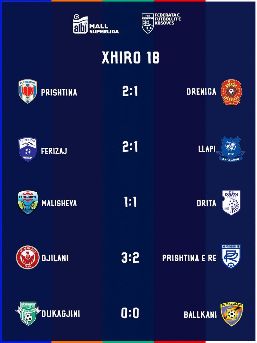 Malisheva, në anën tjetër, e ndali Dritën në barazim 1-1, ku Jorgo Pëllumbi shënoi fillimisht për gjilanasit, por Xhemal Ibishi barazoi në fund.