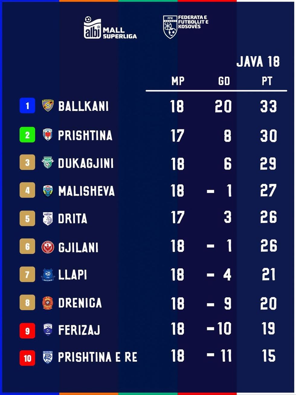 Ballkani mbetet lider me 33 pikë dhe vetëm një fitore e Prishtinës (30 pikë) do të mund ta zinte në renditje, por jo ta kalonte, pasi edhe me golaverazh dhe në ndeshjet e ndërsjellta, falë goldallimit, suharekasit janë më mirë.