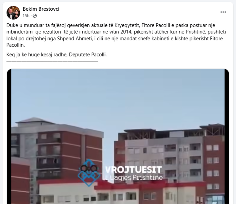 "Duke u munduar ta fajësoj qeverisjen aktuale të Kryeqytetit, Fitore Pacolli e paska postuar një mbindërtim që rezulton të jetë i ndërtuar në vitin 2014, pikërisht atëherë kur në Prishtinë, pushteti lokal po drejtohej nga Shpend Ahmeti, i cili në një mandat shefe kabineti e kishte pikërisht Fitore Pacollin. Keq ja ke huq kësaj radhe, deputete Pacolli", ka deklaruar Brestovci.