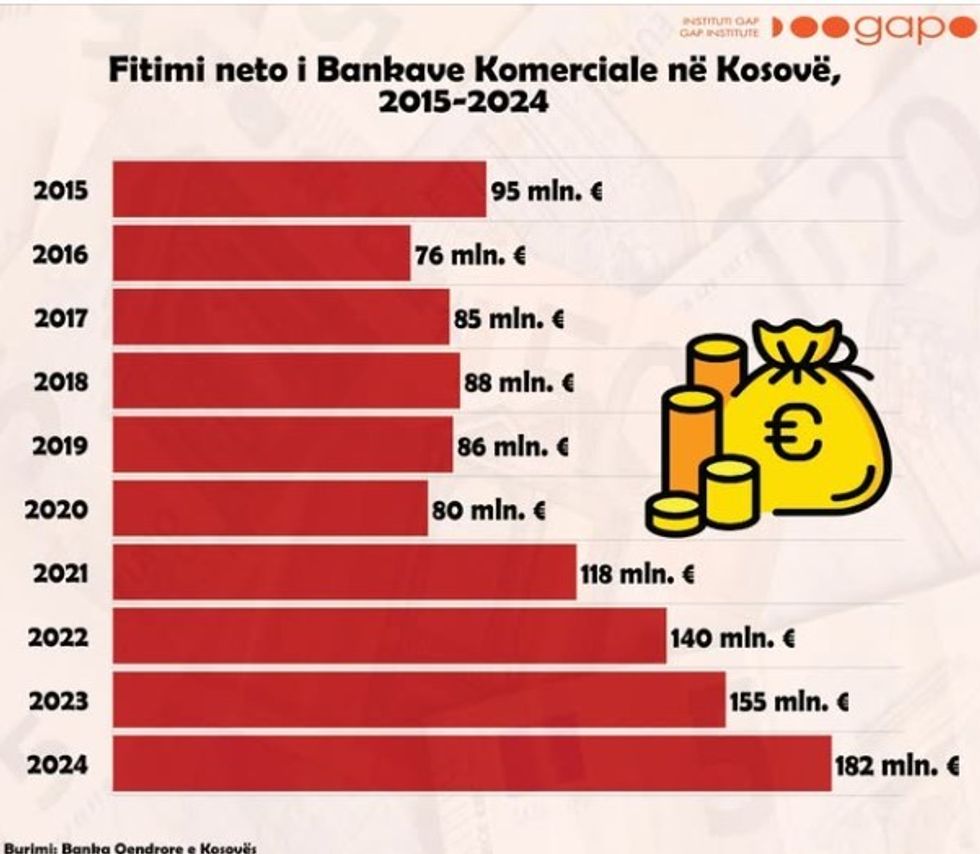 Ndërkaq, javë më parë GAP ka prezantuar një grafikë ku ka treguar se fitimi neto i bankave komerciale në Kosovë në vitin 2024 ishte 182 milionë euro, apo rreth 17% më i lartë krahasuar me vitin 2023.