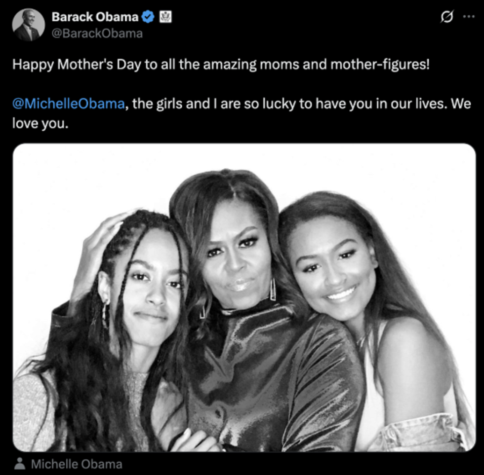 “Gëzuar Ditën e Nënës për të gjitha nënat dhe figurat amësore të jashtëzakonshme!”, shkroi ish-presidenti të dielën në platformën X, bashkë me një foto të Michelle me dy vajzat e tyre, Malia, 26 vjeç, dhe Sasha, 23 vjeç.