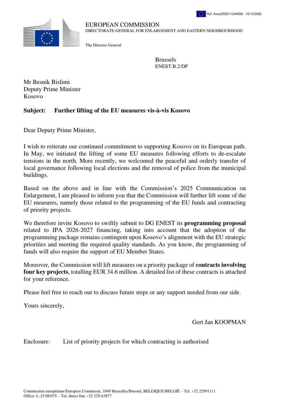 Bazuar në këto zhvillime dhe në përputhje me Komunikimin e Komisionit për Zgjerimin 2025, Komisioni Evropian ka autorizuar heqjen e mëtejme të disa masave, duke ftuar Kosovën që sa më shpejt të dorëzojë propozimet për financimin IPA 2026–2027.
