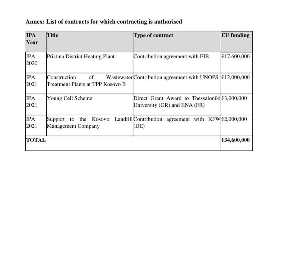 Sipas letrës, masat e hequra përfshijnë një paketë prioritare kontratash që mbulojnë katër projekte të mëdha. Është autorizuar lidhja e kontratës për impiantin e ngrohjes qendrore të Prishtinës në vlerë prej 17.6 milionë eurosh, në kuadër të një marrëveshjeje kontributi me Bankën Evropiane të Investimeve.
