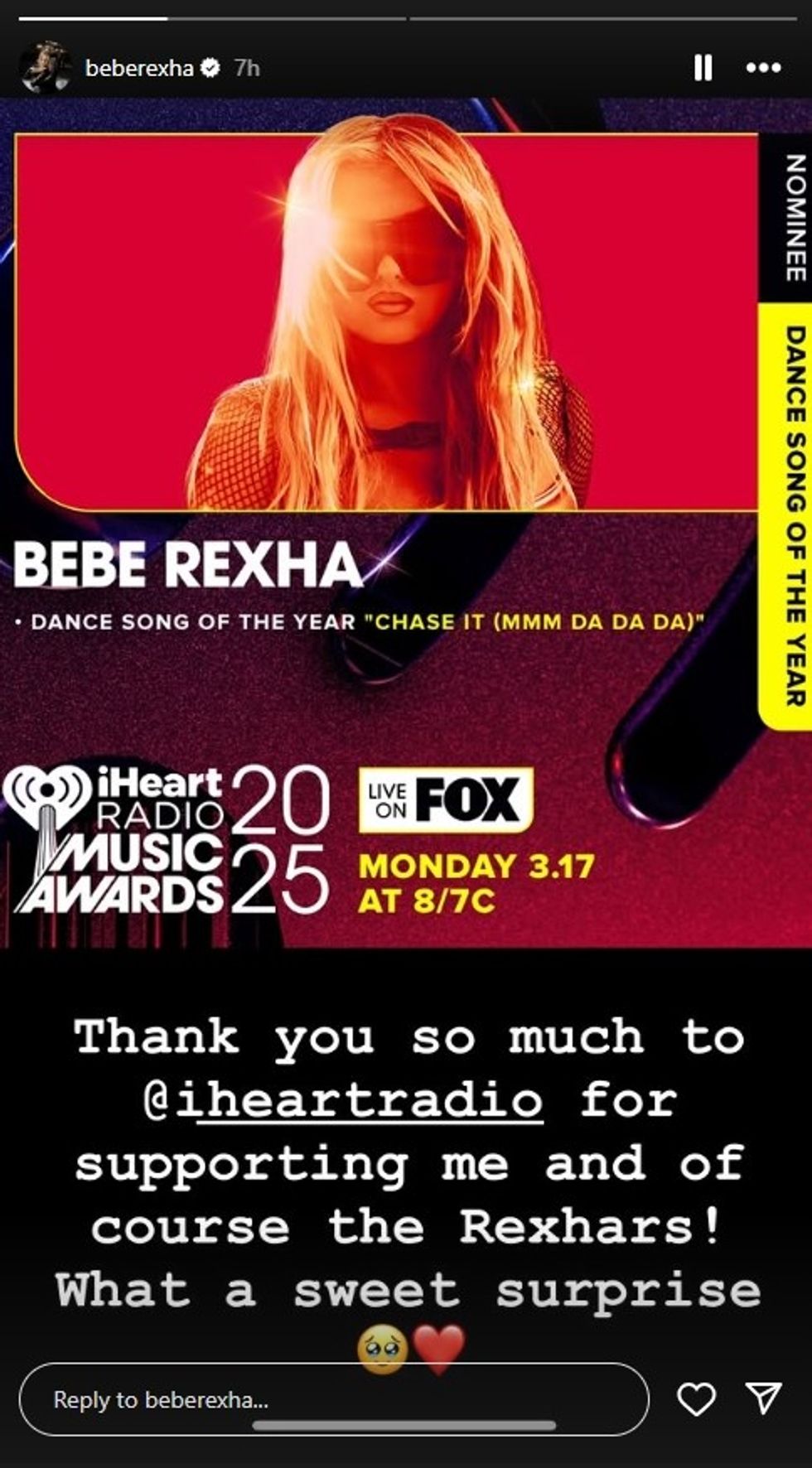 Bebe Rexha është nominuar për këngën e saj hit, "Chase It (Mmm Da Da Da)", në kategorinë "Kënga ritmike e vitit". Në një postim emocionues në InstaStory, ajo falënderoi iHeart Radio dhe fansat e saj.