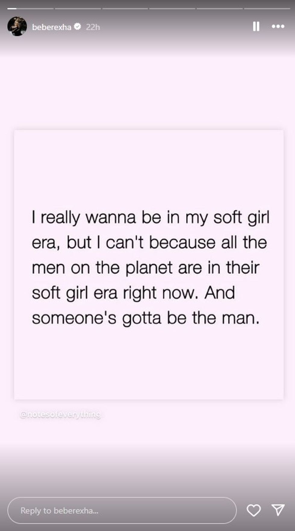 Këngëtarja shqiptare me famë botërore, Bebe Rexha, ka shkaktuar një reagim të fortë në rrjetet sociale me një video të shpërndarë në InstaStory, ku ka thumbuar gjininë mashkullore, duke folur për konceptin e "vajzës së butë" dhe sfidat që vijnë me këtë periudhë.
