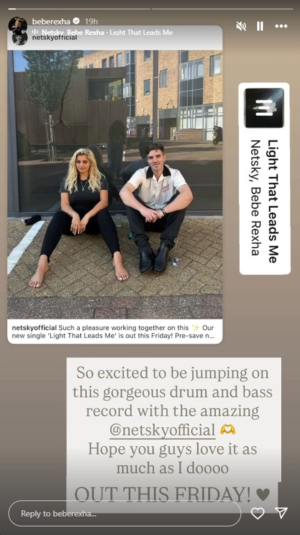 “Jam shumë e lumtur që jam pjesë e këtij projekti të mrekullueshëm drum and bass me të jashtëzakonshmin @netskyofficial. Shpresoj ta pëlqeni po aq sa e dua unë. Del këtë të premte!”, ka shkruar ajo në InstaStory.
