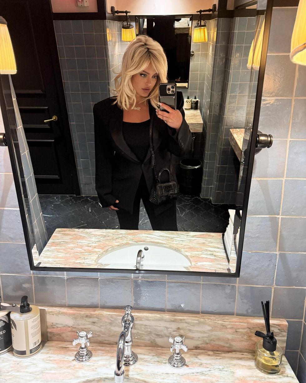 Këngëtarja e njohur shfaqet elegante dhe plot klas, e veshur me një kostum të zi, ndërsa flokët e saj bionde janë stiluar në frymën ikonës së muzikës country, Dolly Parton.