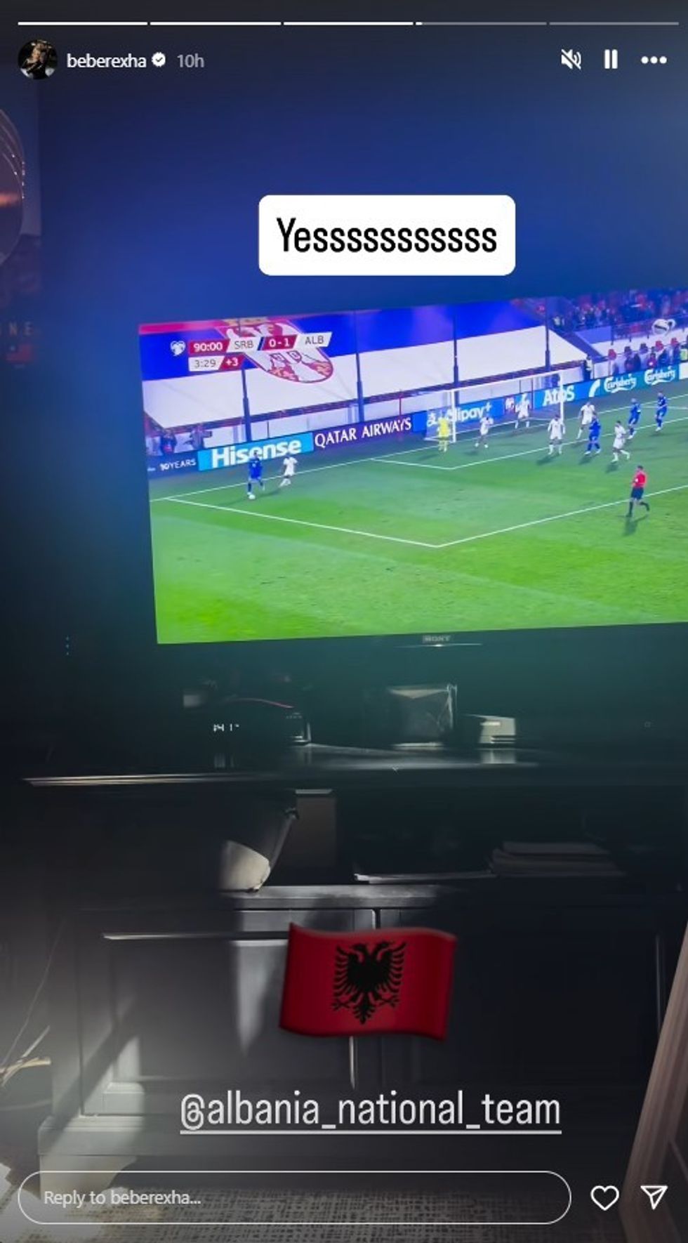 Në mbishkrimin e videos, këngëtarja ka shkruar “Yesssssssssss”, shoqëruar me flamurin shqiptar dhe duke përmendur llogarinë zyrtare të Kombëtares në Instagram, @albania_national_team.